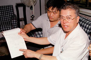 李洪志曾住院手术(二) ![]() 8月3日,吉林省人民医院发现李洪志曾在该医院做过阑尾炎手术的住院病历。李洪志在1984年7月8日早晨突 发急性化脓性阑尾炎,住进吉林省人民医院普通外科,发烧38.9度,于当天下午实施阑尾切除手术,住院10天。由于当 时医生笔误,错将李洪志写作“李宏志”,根据病历上的患者年龄、工作单位、家庭住址及家属(李妻)的手术签字,可确定 患者即李洪志。图为当时为李洪志做手术的主治医师、现吉林省人民医院副院长李英杰(右)讲述当年为李洪志确诊手术的情 景。张宝江摄(新华社稿 传真照片) |