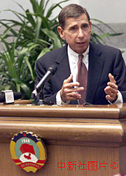 美国前商务部长坎特16日在北京举行的“21世纪论坛”2000年会议午餐会上演讲时指出:中美确实需要加强多层次的合作。中新社记者:李刚 摄