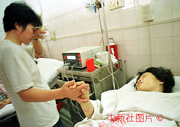 广东江门烟花厂大爆炸中的幸存者--女工邓凤婵脾部撕裂、深度昏迷。她的姐姐在病榻前默默饮泣。轩慧 摄