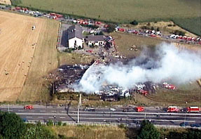一架法国协和式客机二十五日下午在法国巴黎郊区机场起飞后不久堕落戈内斯,撞向一间酒店及餐厅,引起熊熊大火及浓烟。(据外电报道)