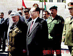江泽民主席十五日抵达伯利恒对巴勒斯坦进行国事访问,巴勒斯坦总统阿拉法特举行欢迎仪式。中新社记者:彭伟祥