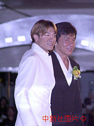 成龙十六日晚与刘德华一齐步入星光大道,出席第十九届香港电影金像奖颁奖晚会。中新社传真洪少葵摄