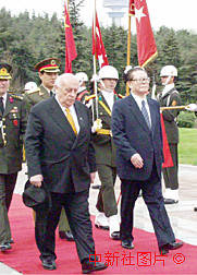 土耳其总统德米雷尔在4月19日在总统府举行仪式,热烈欢迎江泽民对土耳其进行国事访问。中新社记者 彭伟祥 摄