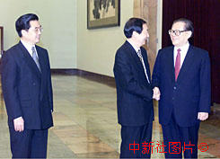 中国国家主席江泽民,二十八日结束对亚欧非六国的访问回国,国务院总理朱(金加容)基、国家副主席胡锦涛到人民大会堂迎接。中新社记者 满会乔 摄
