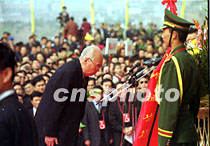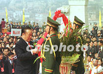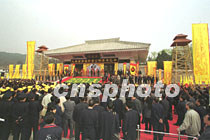 图文:海内外华夏子孙公祭黄帝陵 2001年4月6日 08:01 ![]() 陕西黄帝陵大祭祖。中新社记者 宋吉河 摄 ![]() 王光英向轩辕黄帝画像敬献花篮。中新社记者 宋吉河 摄 ![]() 万国权向轩辕黄帝画像敬献花篮。中新社记者 宋吉河 摄 中新社西安四月五日电(王彦平)清明节的黄帝陵,雨后初霁,阳光普照,农历辛巳年公祭轩辕黄帝典礼今天在此隆重举行。 今天在象征九五之尊的九点五十分,公祭典礼正式开始。全场肃立后,代表三十四个省、市、自治区和特别行政区的三十四响礼炮响起,人们的目光投向空中,仿佛在聆听中国十二亿九千五百万华夏子孙和众多海外同胞向中华人文初祖所要表达的殷殷怀念与追思。 海内外各界参祭代表,在入口广场肃立静候片刻后,随古朴、庄严的祭祀仪俯队,过轩辕桥观龙尾道,来到轩辕庙前。 随后鼓乐齐鸣,在威武的礼仪士兵引领下,全国人大常委会副委员长王光英、全国政协副主席万国权等分别向黄帝像敬献花篮。 在身着盛装的礼仪小姐们向始祖敬献了鲜花、时果等祭品后,陕西省省长程安东恭读了辛巳年清明公祭轩辕黄帝祭文。 最后,所有参祭的各界代表向黄帝像行三鞠躬大礼。(完) |