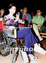吴小莉带脚伤参加大学生申奥会。中新社图 魏孝明 摄