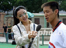 6月9日,加入“万里行”车队的影视明星刘蓓客串主持,采访甘肃男子曲棍球队。中新社图 魏孝明 摄