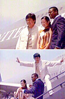 图:成龙新作《尖峰时刻2》举行首映式 2001年07月31日 15:55 ![]() 功夫巨星成龙最新完成的影片《尖峰时刻2》日前在洛杉矶直飞香港的飞机上进行首映,这是近四十年来第一部在空中飞行过程中举行首映式的影片。图为成龙、章子怡、克里斯·塔克在举行首映式的飞机上。