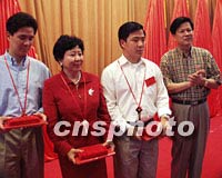 海南文昌市18日授予孙穗芳(左二)荣誉市民称号,并向孙女士赠送金钥匙一把,以表彰孙穗芳对文昌宋氏祖居的关切和支持。孙穗芳的两个儿子王祖荣和王祖耀同时被授予荣誉市民。中新社图 王辛莉 摄