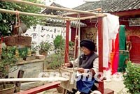 在中国云南丽江,一名纳西族勤劳的老妇,岁末天明之时在家院中为新年赶制节日纺织礼品。中新社记者 孙自法 摄