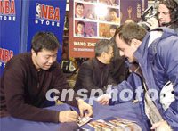 ![]() 今天中午,达拉斯小牛队的高大中锋王治郅出现在纽约市中心NBA专卖店里。他是第一个被美国职业篮球队选中的中国球员。为表彰他的卓越才华和对篮球运动的贡献,一套以他个人肖像为主题的法定邮票今天开始公开发售。中新社记者 陈建 摄