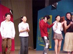 评论:时尚喜剧《翠花,上酸菜》因何火爆? 2002年02月06日 10:16 ![]() 翠剧主要贯穿人物王小怡(乔瑜岩饰) 南方鲲 摄 ![]() 翠花上酸菜演员谢幕 南方鲲 摄 中新网北京2月6日消息(作者南方鲲)中戏表演98班集体改编创作的喜剧〈翠花,上酸菜〉,在年终岁末火爆了京城话剧舞台。目前正在实验话剧院剧场进行第三轮演出。 由班主任田有良导演、这个班十几位初出茅庐的同学协力演出的这出戏,取材当今都市青年网民的时尚生活——网上交友求偶的种种经历,这些多半浅俗入世或时显奇诞不经的人物遭遇,如何在该剧中能演绎得环环相连令人忍俊不禁,以至这部内容看似平常的喜剧先于去年十二月在青艺剧场劲演旬余、新年一月份移师儿艺剧院再演十来场均场场爆满,以至其票房效益居同期首都话剧界之首呢? 仔细琢磨一下该剧就能看出,年轻的导演和演职员们对改编原作电视剧的素材作了颇有艺术追求的再创作。他们让主要角色表演及所构成的生活图景,不时或因时尚行为卡通化、而具诙谐反讽之效;或因男女角反串演示和“土”“洋”人物定位倒置、而显其黑色幽默韵味。另一更突出的效果,则因编导颇具匠心地将时下人们耳熟能详的电视广告语言,(包括一组以新闻形式出现的宣传广告),经由表演形象再现,将其固有的浮躁夸张色彩聚焦放大,铺染在全剧各段落之间,和剧中的奇、躁色调形成别致的参差对照,凸显了观照时尚生活之荒诞性的黑色幽默。 显然,《翠》剧年轻的创作者们在透视概括生活的厚度和表现力度上尚有加强的余地,然而可贵的是,他们对现代话剧艺术的理解显示出有着一种灵敏的悟性;有了这种悟性,才可能在本文称为时尚喜剧的创作中,做到“浅入深出”(实应为“潜入深出”)。正因为如此,见多识广的北京观众对该剧给予了相当热情的接纳。