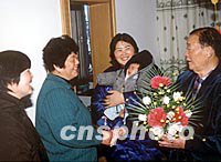 图:八十五岁台湾老兵喜得贵子 2002年02月28日 10:59 ![]() 八十五岁台湾退役老兵周仕安与年青的妻子潘根群(中)近日在老家浙江省诸暨市草塔镇喜得贵子,当地政府官员为其送来花篮表示祝贺。中新社图 杨新 摄