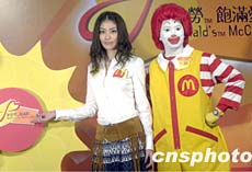 图:陈慧琳在太阳道具贴上《麦当奴饱满爱》标志 2002年03月20日 19:54 ![]() 歌星陈慧琳20日在香港出席《麦当奴·饱满爱心暖万家》慈善活动揭幕仪式,麦当奴叔叔陪同陈慧琳在太阳道具贴上《麦当奴饱满爱》标志。中新社传真 邓庆乐 摄