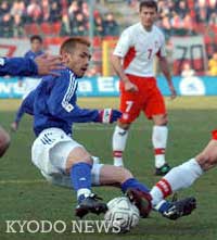 图文:中田英寿大放异彩 日本队2比0完胜波兰队 2002年03月28日 10:44 ![]() 日本国家队头号球星中田英寿率领球队击垮欧洲老牌劲旅波兰队(图/共同社) 中新网巴黎3月28日消息:当地时间27日傍晚,日本足球队与波兰足球队进行了一场国际友谊赛,日本队以2比0完胜对手。继21日和乌克兰队交手之后,这是日本队在强化比赛中的二连胜。 比赛中日本发挥出色,在场面上完全压倒在欧洲赛场战绩不俗的波兰队。上半场第10分钟,刚刚和主教练特鲁西埃重归于好的中田英寿首先破门,为日本取得领先优势。第42分钟时,在阿根廷博卡青年队效力的年轻前锋高原直泰再下一城,使日本队以2比0完胜对手。 赛后,日本队主教练特鲁西埃对比赛进行了总结,他分析比赛胜利的原因是:自从去年0比5惨败给法国队后,球队吸取了教训。大家对日本队完全压制住波兰队特点充满了自信,这非常好。正在欧洲效力的四名队员表现也相当不错。小野和中田英寿配合的很娴熟,铃木隆献身般的拼抢也很突出。