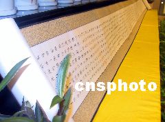图:佛教信众谢宗林捐赠二十四米《金刚经》 2002年04月02日 16:40 ![]() 佛教信众谢宗林4月2日向海南三亚南山海上观音捐赠二十四米《金刚经》佛教书法长卷,被藏于一百零八米海上观音金刚洲基座内。中新新社记者 关向东 摄