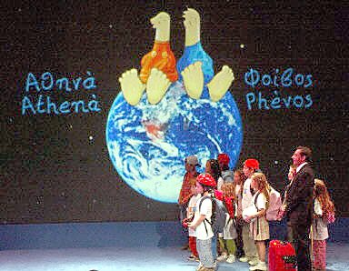 雅典儿童在4月4日的一个典礼上,站在银幕前听2004年雅典奥运会两个吉祥物的起源讲解。法新社