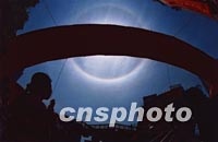 图:福州突现日晕外“晕”奇观 2002年04月14日 19:08 ![]() 十三日上午福州上空出现一道瑰丽的奇观:在灿烂的太阳周围有一个耀眼的光环。半小时过后,出现一个相对颜色浅一些的光环(如图)。十几分钟后,光环渐渐淡去,这种美丽奇观前后持续了约一个多小时,让观者啧啧称奇。据省气象台说;这种现象在气象学中称“日晕”,对天气没有什么影响。中新社图 杨婀娜 摄