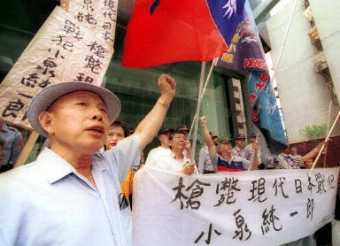 图文:当局懦弱胆小 台湾民众示威抗议小泉参拜 2002年04月24日 10:42 在台北的日本交流协会门外,示威民众拉起横幅抗议日本首相小泉纯一郎日前参拜靖国神社。(法新社) 中新网香港4月24日消息:台北讯,一批台湾民众周二上街示威,高呼“打倒日本军国主义”的口号,抗议日本首相小泉纯一郎参拜靖国神社。 综合外电报道,示威者聚集在日本驻台北代表办事处外,挥动拳头,高举写有“处死当代战犯小泉纯一郎”的标语牌。 周日,小泉到靖国神社参拜,靖国神社供奉有包括二战甲级战犯东条英机在内的一批战犯的牌位,是宣扬和支持军国主义对外侵略战争的精神支柱和象征,也是日本一些极右人士企图为战争罪犯张目、为军国主义借尸还魂的封神坛。 小泉继去年再次参拜靖国神社,引起中国大陆及韩国政府的愤怒,两国并提出正式抗议。 但台湾当局执行亲日本的政策,避免批评小泉,在台湾,抗议示威的规模比韩国的要小。 陈姓示威者说,台湾政府懦弱,胆小,不敢谴责小泉参拜。他说,“我们不须憎恨日本人,但我们不能忘记历史。” 示威者中许多人经历过日本对中国的野蛮侵略,他们认为日本仍不肯面对历史,承认其战争暴行。 相关报道:台湾报纸发表社论谴责小泉再度参拜靖国神社 相关报道:台北"理解与宽容"小泉参拜被批患有"历史软骨症" 相关报道:中国驻日大使就小泉参拜靖国神社提出严正交涉 相关报道:南京大屠杀幸存者集会抗议小泉参拜靖国神社 相关报道:香港多个团体到日本驻港机构请愿 抗议小泉参拜 相关报道:中国对小泉纯一郎参拜靖国神社表示强烈不满 相关报道:李肇星就日本首相参拜靖国神社向日方严正交涉 相关报道:陈水扁首次就小泉参拜靖国神社发表评论 相关报道:李登辉再次鼓吹小泉参拜靖国神社很自然 相关报道:小泉参拜靖国神社 中方表示强烈不满和愤慨