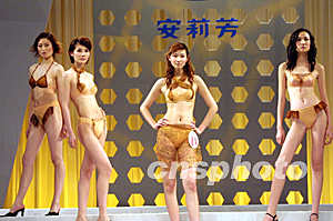 图:上海国际服装文化节上演时尚内衣秀 2002年04月27日 09:02 ![]() 二○○二“中华杯安莉芳”国际内衣设计大赛二十五日在上海世贸商城举行。图为模特在展示中外年轻设计师们设计的富有新意的内衣。中新社图 汤彦俊 摄