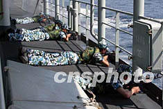 中国海军编队穿越马六甲海峡进行反海盗演练(图) 2002年05月28日 16:45 ![]() 北京时间5月28日凌晨,中国海军首次环球航行访问舰艇编队,穿越长约600海里马六甲海峡,驶入印度洋时,“太仓号”综合补给舰的官兵日夜戒备,并进行反海盗演练。张全跃 摄