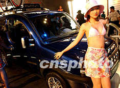![]() 身穿沙滩泳装的吉普女郎,在北京炎热天气里的六月国际车展上充满浓郁的青春气息。贾国荣 摄