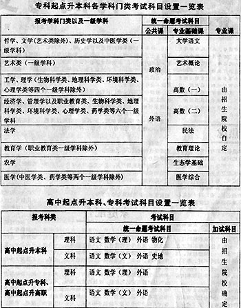 全国成人高考科目设置明年将作进一步调整(附表) 2002年06月05日 16:09 ![]() 中新网北京6月5日消息:据中国教育报报道,为了使考试科目的设置更加适应成人高等教育的特点,更有利于提高成人高校招生的生源质量和今后的培养,有利于考试的组织和管理,从2003年起中国成人高校招生考试科目设置做进一步的调整: 1.专科起点升本科统考科目按学科门类设置,不再按生源类别设置。统考科目为政治、外语和专业基础课3门。专业基础课根据各学科门类的特点设置8门(见专科起点升本科各学科门类考试科目设置一览表),由招生院校按专业的需要规定考生应试其中一门。 2.高中起点升专科(含高职)、高中起点升本科考试按文科、理科分别设置统考科目。其中,高中起点升专科(含高职)统考科目为语文、数学(分文科类、理科类两种,下同)、外语3门,主要考查考生是否具备接受高等专科层次教育的最基本要求。考虑到本科教育与专科教育培养目标和教学要求的不同,报考高中起点升本科的统考科目的理科类考生增加一门“物理化学综合课”(简称物化),文科类考生增加一门“历史地理综合课”(简称史地)(见高中起点升本科、专科考试科目设置一览表)。 3.各类考生除参加上述规定的统考科目考试外,招生院校可根据专业要求自行确定是否再加试一门考试科目。如需加试,招生院校必须在招生简章中注明并自行命题和组织考试,于录取工作开始前,向有关省级成人高校招生办公室提交加试合格考生名单。录取时,省级成人高校招生办公室根据加试合格考生名单向招生院校投档,招生院校根据考生参加统考的成绩,由高分到低分择优录取(艺术类和体育类专业在考生文化课符合要求的基础上,按加试专业课成绩从高分到低分录取)。不需加试的院校,按考生参加统考科目的成绩录取。 4.统考科目除专科升本科考试的民法试题由司法部命制外,其他试题均由教育部统一命制。各门试题满分为150分;高中起点升本科、专科的统考科目每门考试时间为120分钟,专科升本科每门考试时间为150分钟。