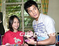 歌星郭富城24日在香港探访保良局小朋友,该局的女歌迷难得与偶像近距离接触,纷纷向偶像索取签名。邓庆乐 摄