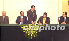 图:澳门政府与银河公司签署博彩经营批给合同 2002年06月27日 11:13 ![]() 澳门特区行政长官何厚铧二十六日在澳门政府总部舆银河娱乐场股份有限公司董事吕志和(左二)、范少朋(左一)签署娱乐场幸运博彩经营批给合同。中新社记者 李刚 摄
