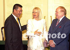 ![]() 澳门特区行政长官何厚铧二十六日舆银河签署协议后,和美国拉斯维加斯金沙公司董事长、银河主要股东肖登·艾德森夫妇亲切交谈。中新社记者 李刚 摄
