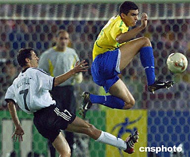图:世界杯德巴决战 卢西奥腾空跃起阻挡对手 2002年06月30日 19:49 ![]() 6月30日2002韩日世界杯决赛巴西与德国队的决赛在日本横滨国际竞技体育场进行,上半场比分为0:0。图为巴西队卢西奥腾空跃起阻挡德国前锋诺伊维尔。