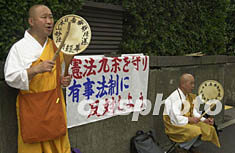 图:日本僧侣国会前反对有事法制 2002年07月02日 20:10 ![]() 日本山妙法寺的僧侣在国会议员会馆前颂经,反对正在国会审议的有事法制,要求日本政府严守“放弃战争”的宪法第九条。作者:陶光雄