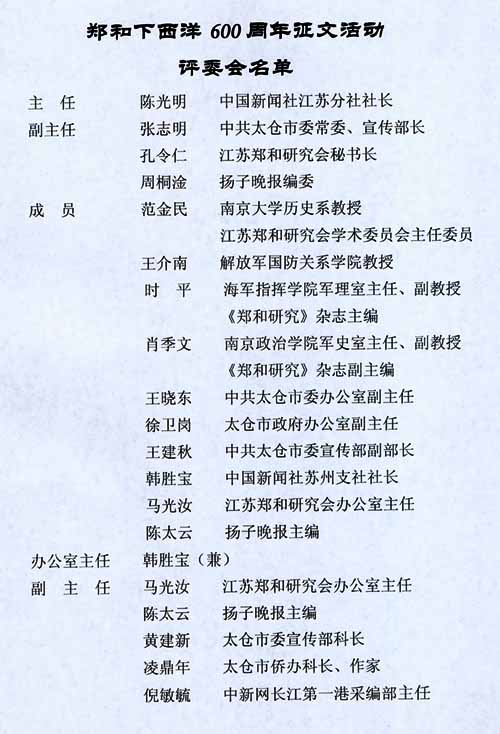 “郑和下西洋600周年”征文启示 2002年07月05日 10:36 ![]() 郑和下西洋600周年征文活动评委会名单 为纪念郑和下西洋600周年,弘扬郑和开放和探险精神,进一步提升郑和七下西洋起锚地太仓的知名度,促进太仓的两个文明建设和经济发展,特举行征文活动。 一、征文时间 从2002年7月11日起(郑和下西洋纪念日)至2003年7月11日止。 二、征文内容 围绕郑和七下西洋起锚地太仓与郑和,从历史与现实的结合上,从跨越600年的时间和空间中,从不同视角充分展示郑和精神及给太仓历史、经济、文化等方面带来的影响。 三、征文形式 1、学术论文类; 2、文学类,包括小说、散文、随笔、诗歌、故事、盈联等; 3、新闻类,包括消息、通讯、特写、专访、述评等。 四、征文字数 论文一般不超过5000字;文学作品一般不超过3000字(长、中篇小说例外);新闻一般不超过1500字。 五、征文刊用 征文作品在中新江苏网、中新网长江第一港、扬子晚报“聚焦苏锡常”专版、《郑和研究》杂志刊用。 六、征文评比 征文颁奖活动在2003年9月份举行,评出论文类、文学类、新闻类一等奖各一名,奖金3000元;二等奖各三名,奖金1500元;三等奖各五名,奖金500元,另评出荣誉奖若干名。 七、征文请寄江苏省太仓市体育东路58号,中新网长江第一港编辑部,邮编215400。另电子文档以word形式保存,寄jiangzhenjiang@chinanews.com.cn作者请自留底稿,所有应征作品一律不退稿。 八、本次征文活动解释权在征文活动组委会。 主办单位:太仓市委、市人民政府 中国新闻社江苏分社 扬子晚报“聚焦苏锡常”编辑部 江苏郑和研究会 二OO二年七月一日