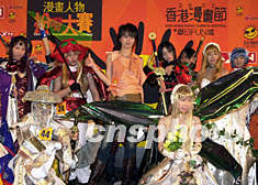 ![]() 歌星梁咏琪23日在香港出席第四届香港漫画节举办之《2002漫画人物扮(左口右野)大赛准决赛》出任嘉宾,赛后与部份入围决赛的参加者一起合照。邓庆乐 摄