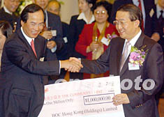![]() "中银香港(控股)有限公司"7月25日成功在香港上市挂牌后,中国银行副董事长,中银香港(控股)有限公司、中国银行(香港)有限公司副董事长及总裁刘金宝(右)向香港公益金筹款委员会主席柯清辉赠送一百万港元支票。任晨鸣 摄