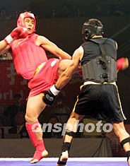 图:首届世界杯武术散打赛在上海拉开战幕 2002年07月25日 19:58 ![]() 首届世界杯武术散打赛二十五日在上海卢湾体育馆拉开战幕,中国“散打王”柳海龙首轮以二比一艰难战胜俄罗斯选手阿土尔,晋级下一轮。图为中国“散打王”柳海龙(红方)在比赛中。作者:汤彦俊