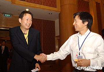 九月二十三日在长沙举行的第二届世界华文传媒论坛上,新浪联席董事长姜丰年(左)与搜狐公司董事局主席兼首席执行官张朝阳相谈甚欢。中新社记者:武仲林