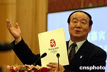 北京奥组委副主席蒋效愚二十三日在长沙“第二届世界华文传媒论坛”上,向与会代表展示北京2008年奥运会徽,并介绍筹备情况。中新社记者:张宇