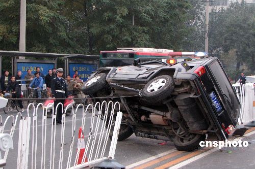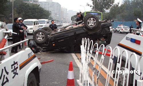 10月30日16时38分许,北京西单白云小桥南约100米处有一辆绿色切诺基撞倒中心护栏后侧翻到马路对面。由于切诺基翻车后撞坏中心隔离护拦,又占用白云路上内侧顺逆行各一条车道,对双向车流产生一定的影响。由于处理及时,未造成该路段大面积拥堵。中新社发 彭启胜 摄
