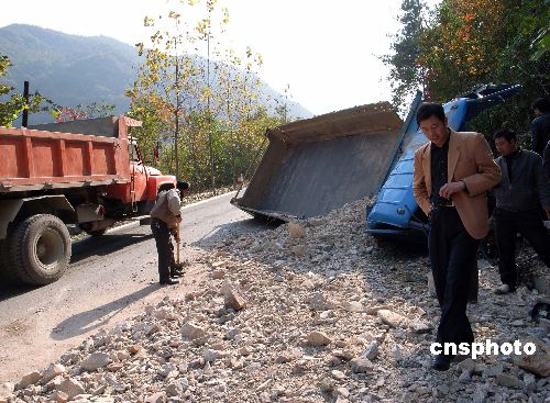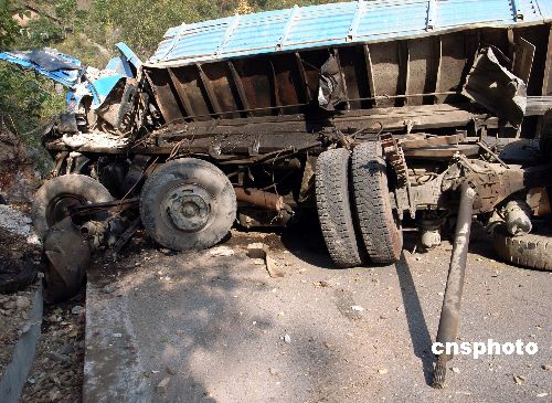 2006年11月7日下午,湖北省南漳境内发生交通事故,司机当场死亡。据当地群众目击者介绍,下午13点左右,一辆鄂F51507拉矿石的客车从保康到襄樊的路途中,车辆行至305省道55公里路段拐弯时,撞至山体,司机跳车时被自己的车辆压死。中新社发 熊明银 摄