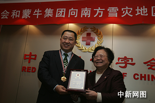 在捐赠现场,蒙牛总裁杨文俊接受了彭珮云签发的红十字勋章和博爱奖章。杨文俊表示,孙中山先生题写的“博爱”这两个字,与蒙牛“愿每一个中国人身心健康”的企业理念完全吻合,蒙牛希望通过红十字会,将三万蒙牛人和几百万农牧民对灾区人民的关心和支持,传递给暴风雪中的人们。