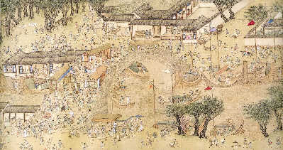 仇英的《清明上河图》比宋本要长一倍,达到9.87米,以明代苏州城为背景,采用青绿重设色方式,画中人物超过2000位,描绘明代江南社会的城乡人民生活实景,表现了热闹纷扰的市井生活和民俗风情,场面宏大,气势雄伟。唐末孙位的《高逸图》(又名《竹林七贤图》)中的画名“孙位高逸图”为宋徽宗赵佶所题,它所描绘的是魏晋时期脍炙人口的竹林七贤的故事。画家通过娴熟高超的技术,出色刻画了魏晋士大夫的精神气质。