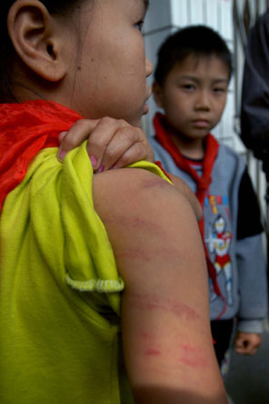 经多方调查得知,前来就诊的这些孩子是福州城山利民学校三年级(2)班的学生。9岁的小莲(化名)是7名孩子之一,她怯生生地拉起了袖子和后背衣服,她的右手臂明显淤痕有6条,左手臂有5条,背上也留下几条淤痕,每条淤痕都有近5厘米长。稍微碰一下,小莲就喊“疼”。在学生小赵、小林等人的身上见到了类似的伤痕。“是英语老师拿教鞭打的,我们不会写英语单词。”学生小赵突然喊道。“对,是她,你看你看,我也被打了。”其他孩子都凑了过来。初步统计,有淤伤的学生约20个。