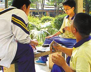 一名初二男生透露,他们班上许多男生都在收集《游戏王》对战卡,这种卡30元可以买10张,抽签决定能否得到精品(日本原装),一般情况下运气好的话兴许能抽到一张真品,在一大沓卡片中显得很另类,能不能碰上“就看自己有没有眼光”,这样的卡从几元一张到百多元一张都有。为了满足“虚荣”多数同学会省吃俭用收集几张每张百多元的真品,有的同学没有钱只好背着家长省下午餐钱,每天中午只买一个面包充饥。
