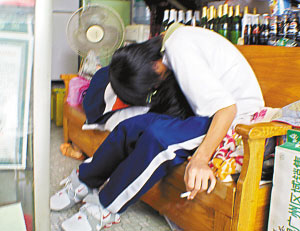 11月2日中午,在广州大新路附近一中学校口。12时20分,放学铃声一响,1000多名学生蜂拥而出。不到15分钟就有9对男女生搭肩拉手亲昵地步出校园。粗略估计至少有四成学生选择不在校用餐,很快校园周围小巷内多家小饭店排起长队。对于不在学校就餐的理由,一位姓秦的初三学生实话实说:在学校午休有不准进行体育活动等诸多限制,一些不想午休的同学就会感到很无聊。