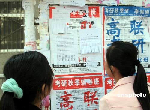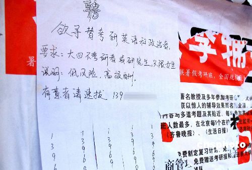 2006年11月,一些寻找考研替考的小广告再度出现在济南一些大学的校园内,但绝大部分大学生看后对此嗤之以鼻。据一些知情大学生介绍,这其中有很多是办假证的骗子以找替考需办证为名骗取钱财,有个别学生受骗,希望学子对此要警惕。 中新社发 周青先 摄