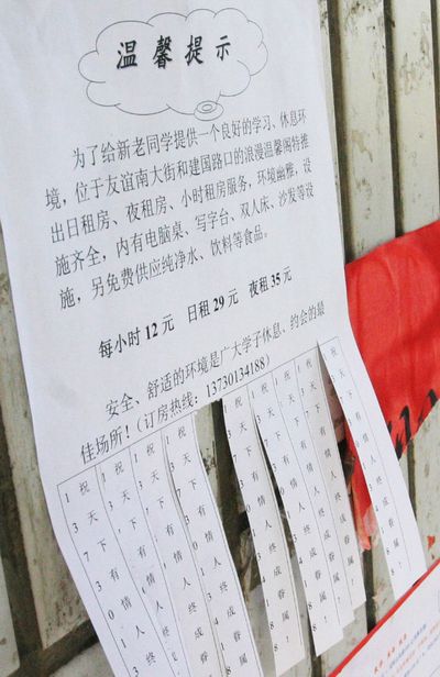 中新网9月7日电 据燕赵都市报报道,近日,众多专为校园情侣设计的“小时房”广告出现在河北石家庄多所高校校园内。就此现象,有大学新生家长表示担忧。从事教育学研究的专家指出,这种广告出现在大学校园内,是对大学生道德观的亵渎,学校和有关部门应对此加强管理。