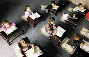 不讲课文、不教英文单词、不上数学。这里教授的大多是朗朗上口的古文,内容包括《三字经》、《百家姓》、《千字文》及《弟子规》等。如果“弟子”们有需求,还会加入古琴、茶道和书画。每堂课近40分钟,学生将按年龄被分别安排在“幼儿班”或“少儿班”内。