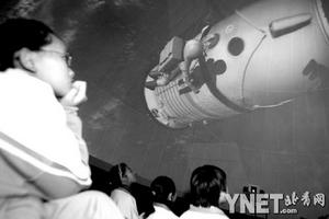 抬头仰望,漫天的星斗。北京57中学的学生坐在学校的穹幕剧场里,宛如身在太空一样,月球在他们的头顶轻轻地转动。随着一声号令,嫦娥一号拔地而起,从他们的头顶奔向月球。不少的学生忍不住想要摸一把“嫦娥”,让“嫦娥”带着他们一起飞向月球。昨天下午1点30分,初一学生江聪迪、王聿伦和同学们一起,这样立体地重温了“嫦娥”奔月的震撼瞬间。