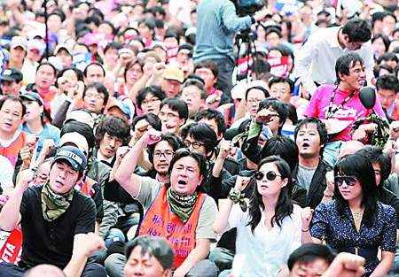 韩国5000多名电影人及民众日前在首尔举行示威,抗议政府实施削减韩国电影配额制。韩国天王Rain事前答应出席,最后却临阵退却。